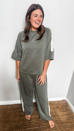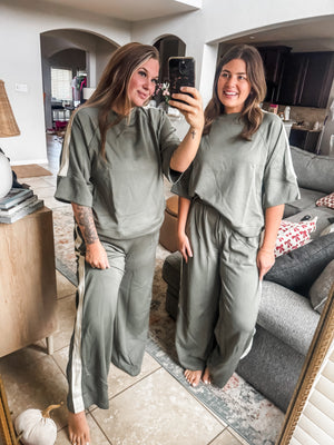 The Daydreamer Set in Olive is your go-to for ultimate comfort and effortless style. Crafted from scuba-like fabric, it feels luxuriously soft and stretchy, perfect for lounging around or tackling your weekend errands with ease. Slip into this set and enjoy a cozy, playful vibe all day long.