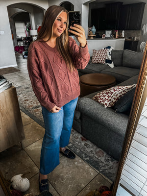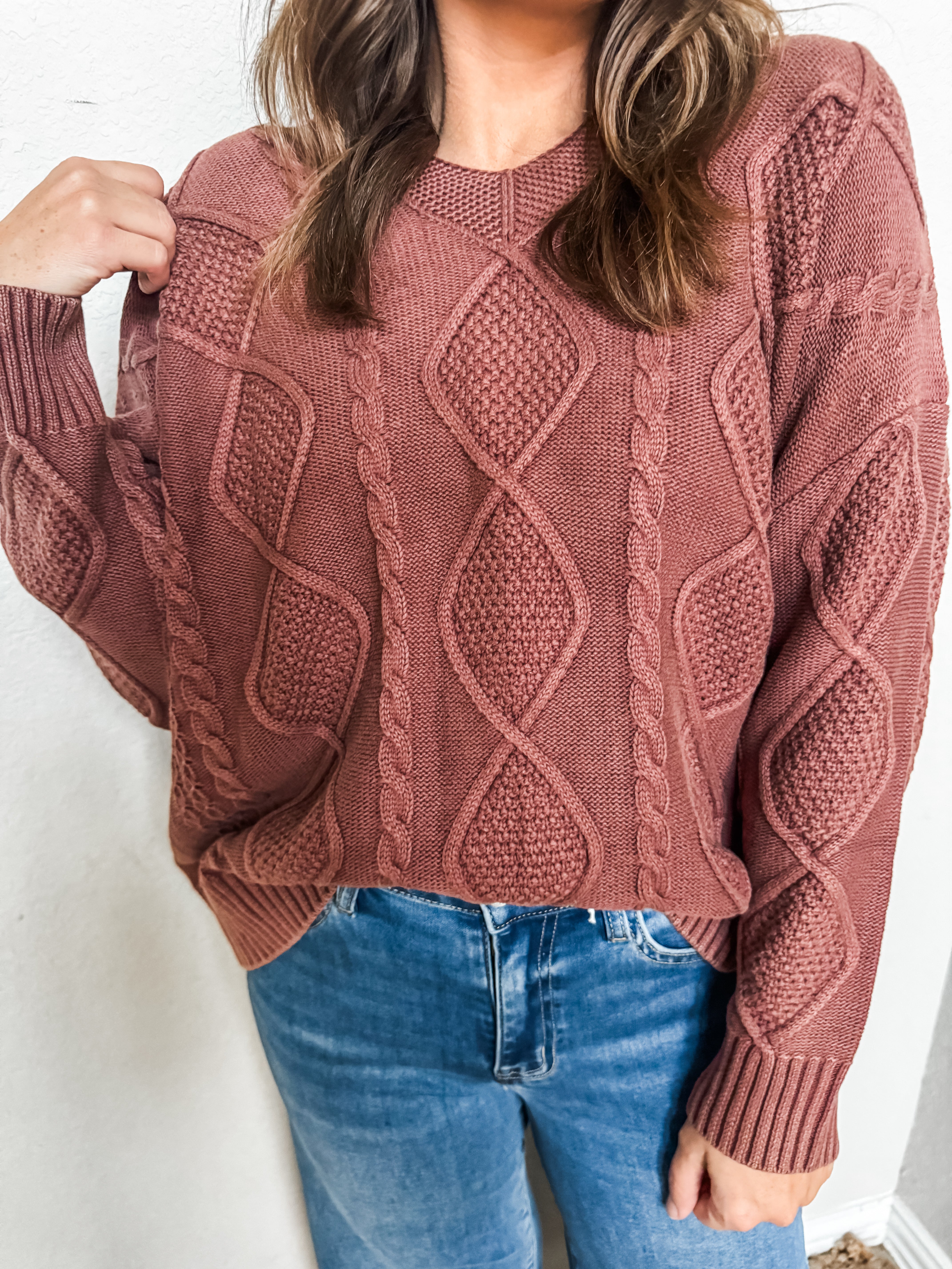 Cozy up in our Rustic Retreat Cable Knit Sweater Top this season! This versatile and stylish piece is a must-have in your wardrobe. Perfect for both dressy occasions and casual outings, this easy-to-wear sweater will be your go-to for fall and winter. Don't miss out, grab yours now!